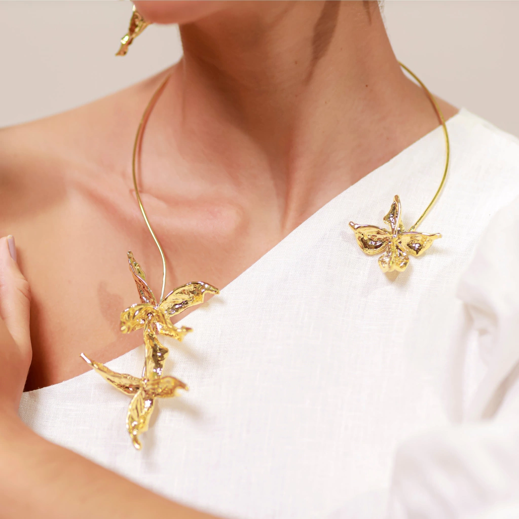 Uma peça feita da flor real do algodão, homenageando a beleza e a força do agro do Brasil. Essa peça única é mais do que uma joia, é uma celebração da natureza e da cultura brasileira.