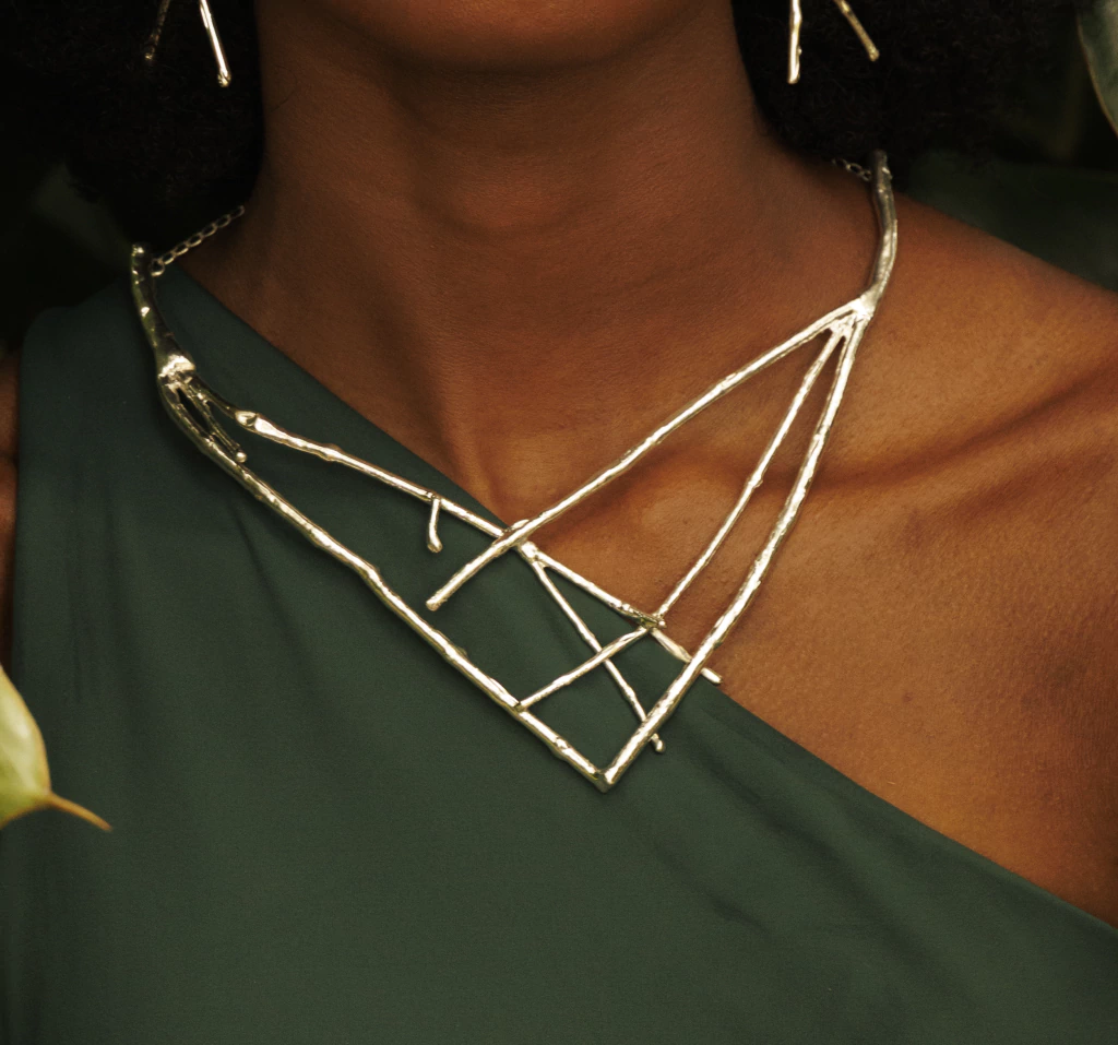 O Colar Elevação repousa sobre o colo como se raízes quisessem tocar o céu. Suas linhas longas e entrelaçadas evocam cipós que se estendem em direção à luz, firmes e ao mesmo tempo etéreos. É um traço orgânico que abraça o corpo com a beleza de uma floresta que pulsa. Criado a partir de um elemento natural, colhido em uma área preservada com carinho pelo pai da nossa diretora criativa, Fernanda Dubeux.