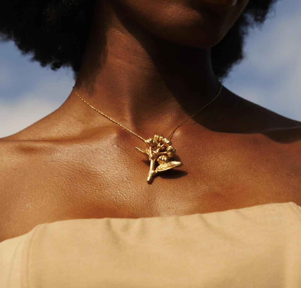 O Pingente Alegria foi criado a partir de um pequeno ramo florido, colhido em uma área preservada com carinho pelo pai da nossa diretora criativa, Fernanda Dubeux. Suas formas delicadas foram mantidas como na floresta, sem moldes. Recebeu o nome Alegria por evocar o frescor das manhãs claras e a espontaneidade das flores que nascem livres. Uma peça viva e cheia de ritmo.